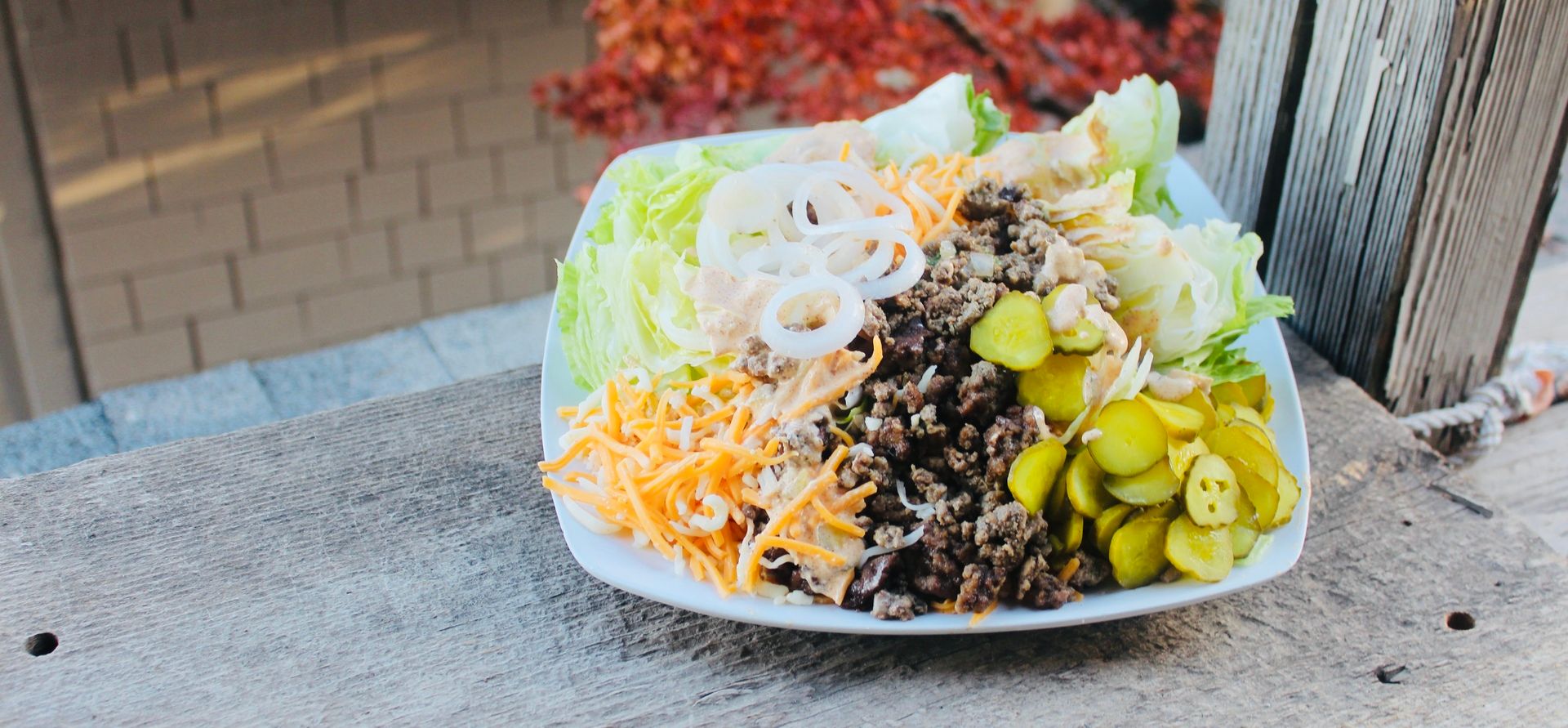 That salad in the photo above is the legendary “Big Mac Salad.” Find it here: https://eatlikeabear.com/big-mac-salad/